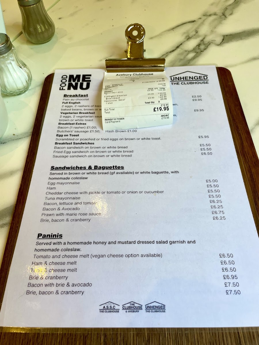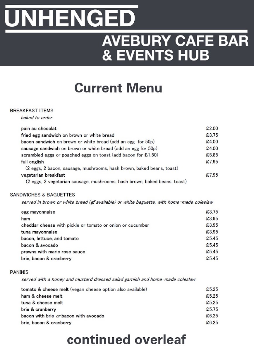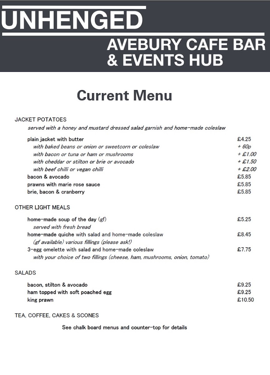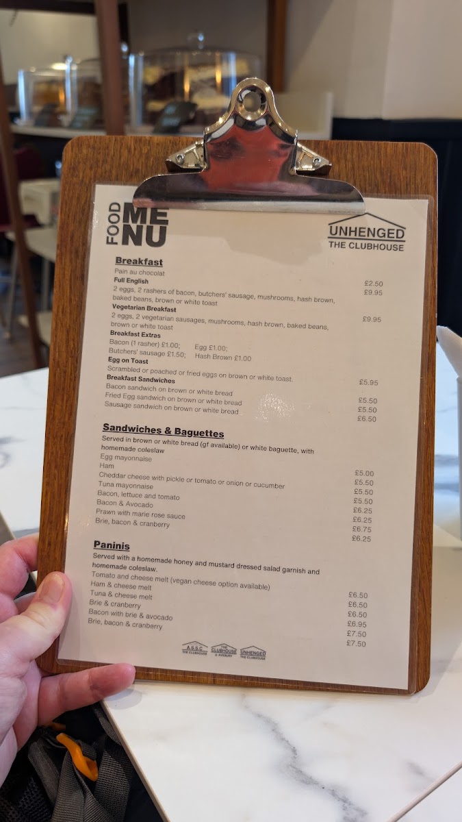 The menu features a variety of options suitable for different times of the day, including breakfast, light meals, and snacks. Visitors can choose from a selection of breakfast items such as a Pain Au Chocolat, a Full English breakfast, and a Vegetarian Breakfast. For lighter midday meals, the menu offers jacket potatoes with a range of fillings including plain butter, bacon and avocado, prawns with Marie Rose sauce, and brie with bacon and cranberry.